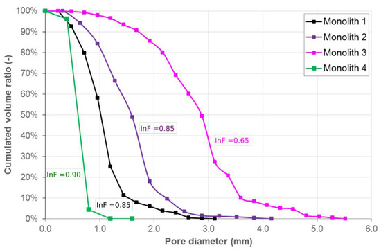 By comparing Monoliths 1 and 2 (Figure 12), it can be seen that the distribution is also impacted by the GN parameter, with larger pore sizes when GN decreases. Finally, the important role of InF is shown when comparing Monolith 3 and Monoliths 1, 2, and 4. The pore sizes are significantly higher for Monolith 3, with a lower InF, and smaller for Monolith 4, with a higher InF.