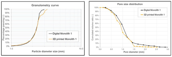 The granulometry curve and pore size distribution curve demonstrate good consistency between the digital model data and the 3D-printed data of Monolith 1, with a slight discrepancy only occurring for larger grains (representing a larger volume for the printed monolith) and pores (representing a smaller volume for the printed monolith). Such observations may be related to the generation of bridges that may associate multiple grains as one grain and cut through pores.