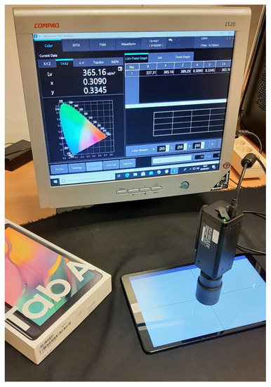- de Fez, D.; Luque, M.J.; García-Domene, M.C.; Camps, V.; Piñero, D. Colorimetric Characterization of Mobile Devices for Vision Applications. Optom. Vis. Sci. 2015, 93, 85–93. [Google Scholar] [CrossRef]