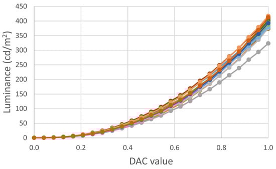 - Barco, L.D.J.; Diaz, J.A.; Jimenez, J.R.; Rubino, M. Considerations on the calibration of color displays assuming constant channel chromaticity. Color Res. Appl. 1995, 20, 377–387. [Google Scholar] [CrossRef]