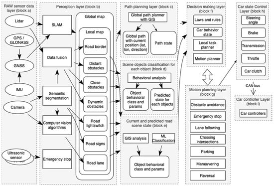 From the point of view of the control system of a self-driving car, several levels of a functional organization are proposed [6]: sensing, environment perception, environment mapping, motion planning, decision making, and actuation.