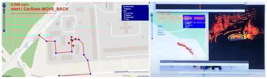 WebDisplayNode—map path constructor and visualization tool (Figure 4). Tool based on OpenStreetMap (offline maps) for planning a route and visualizing the current state of the car (point on the map, distance from key points of start, turn and finish, speed, recognized sign, lidar data, near and far obstacles, and planned path).