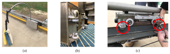 Figure 1b,c show the starting box at the 455 m, the arrangement being common at all starting positions. In the racing event, the greyhounds are initially locked in the starting box. The lure commences its progression around the rail (to the inside of the track—curve marked with red circles in