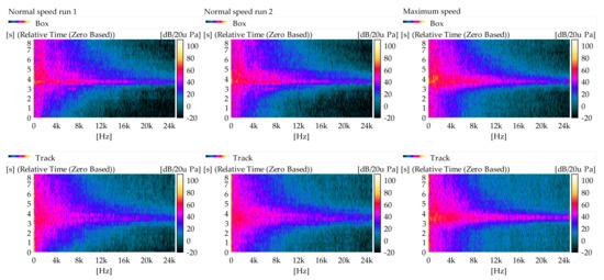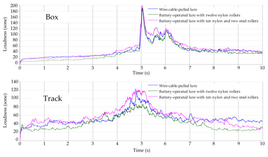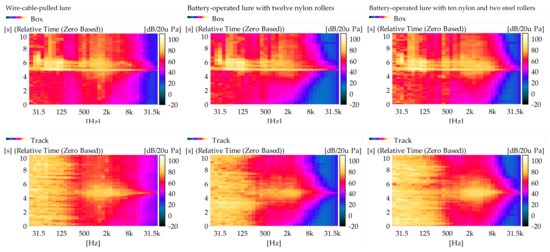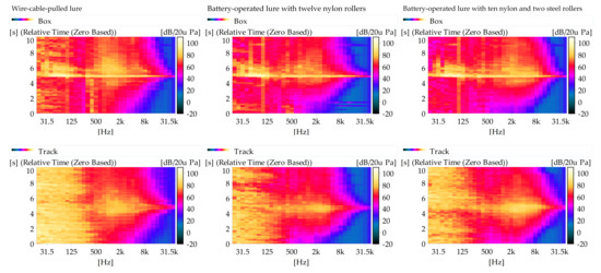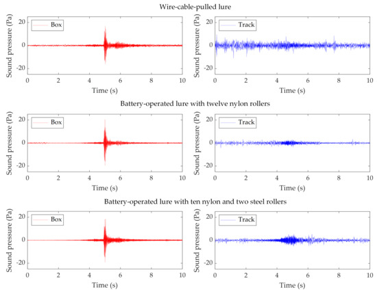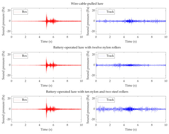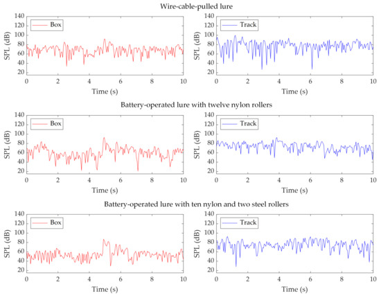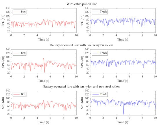 Figure 8. It is found that during the whole process, there are not obvious peaks in the track recordings even when the lures pass the microphone. This indicates that from the SPL perspective, the lure sound does not exceed the environmental noise and is immersed in the environmental noise. The noise measured in the box is significantly lower than that measured on the track, which confirms the sound isolation effect of the starting box. With lower environmental noise in the box, the SPL clearly increases when the lures pass the box. The peak SPL at around 5 s in the box is introduced by the box gate opening.