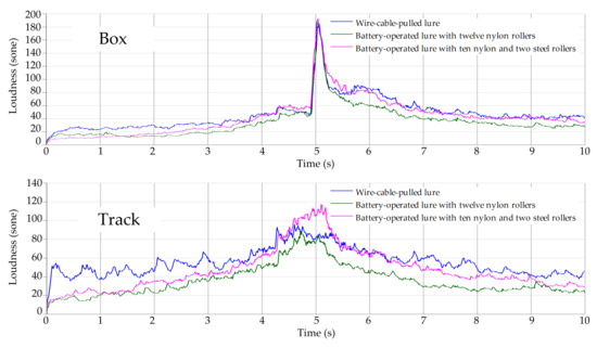 The lure sounds measured on track shows a significant increase in loudness when the lures are close to the microphone. This demonstrates that the lure sounds have clearly higher loudness than the environmental noise due to relatively higher frequency even if they have similar SPL as the noise. It is therefore possible for the near greyhounds to hear and distinguish the lure sounds from the environmental noise during racing. Nevertheless, the battery-operated lure with twelve nylon rollers shows a reduction in loudness when compared to the wire-cable-pulled lure, so it may not provide a similar level of sound excitation as the wire-cable-pulled lure during racing and the greyhounds chasing performance may also be affected by this relatively quieter lure.