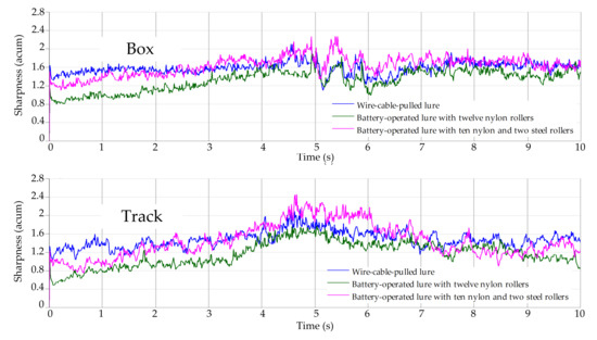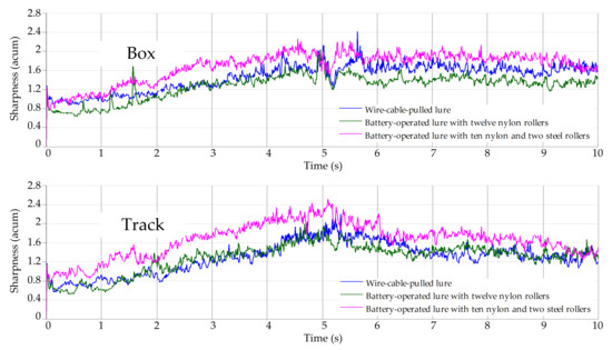 Figure 16 show the sharpness of different lure sounds measured at the 395 m start and the 455 m start respectively. It can be seen that the battery-operated lure shows lower sharpness than the wire-cable-pulled lure when installed with twelve nylon rollers but shows higher sharpness than the wire-cable-pulled lure when installed with ten nylon and two steel rollers. This finding is also supported by the CPB and FFT analysis results where the battery-operated lure sound frequency range is lower with twelve nylon rollers than with ten nylon and two steel rollers.