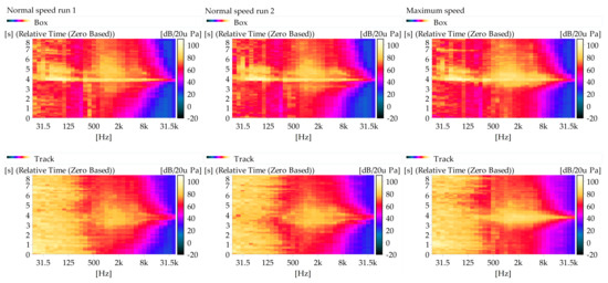 Figure 12. In all figures, the upper row shows the measured data for the microphone installed within the box whereas the lower row shows the corresponding data for the microphone installed on the track, adjacent to the rail.