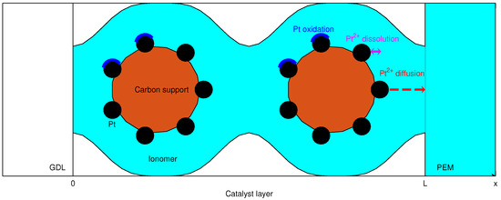 Polymer electrolyte membrane fuel cells (PEMFC) are extensively applied as power sources for various portable devices and vehicles. For effectiveness and high durability of commercial PEMFC, this task challenges the study of degradation of catalyst materials using the valuable platinum metal, see [1,2,3]. The mathematical modeling supported by numerical simulations is well reasoned for better understanding mechanisms, which cause the electrochemical degradation on the Pt surface. In the last decades, numerous publications have been devoted to development of diffusion models of Pt degradation in a catalyst layer (CL) within fuel cells, for which we refer to [2,4,5] and other works. For other mathematical approaches, we cite [6,7,8,9,10,11,12] for modeling nonlinear diffusion in multi-phase media with interface reactions by Poisson–Nernst–Planck equations and [13] for the mechanical degradation due to fracture.