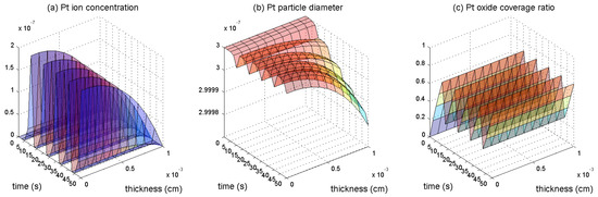 In Figure 3a, we observe the evolution of Pt ions distribution, which is low at the interface with PEM and high when meeting GDL. The concentration is varied periodically from 0 to around (mol/cm). Figure 3b demonstrates the decrease in Pt particle diameter through the catalyst length. The Pt particle diameter decreases faster at the membrane surface at than at the boundary with the gas diffusion layer at . The periodic change in the coverage of Pt surface by platinum oxide during the voltage cycling is depicted in Figure 3c. In every cycle, at the high voltage , the formation of PtO occurs, and at the low voltage , the reverse reaction proceeds such that the platinum oxide is reduced to the platinum. As seen, there is not enough time for the reduction reaction, such that the part of Pt surface is permanently covered by PtO, where the oxide coverage is varied from 40 to 70% of Pt surface. The coverage of catalyst layer and the loss of Pt mass in time will be investigated further in Section 3.