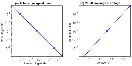 First, we apply the accelerated stress test (AST) with (V) and vary the slope (the rate of potential change) with the ratio ten in the range of (V/s). In Figure 4 versus the slope we plot: (a) a log–log graph of the critical time in seconds, while (b) shows the semi-log plot of the corresponding critical voltage (V), when is attained by computing the problem (3)–(7).