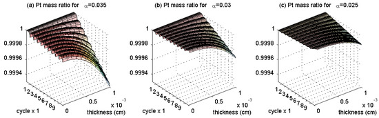 The corresponding Pt mass averaged along the catalyst length is given by three respective curves in Figure 8 at the two scales during 10 voltage cycles in plots (a), and 1000 cycles in plot (b).