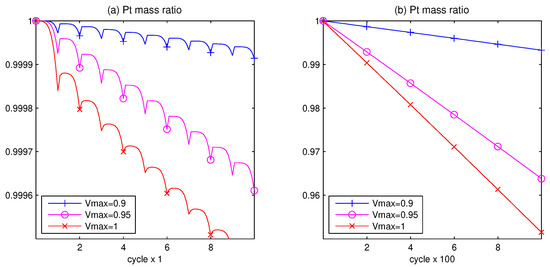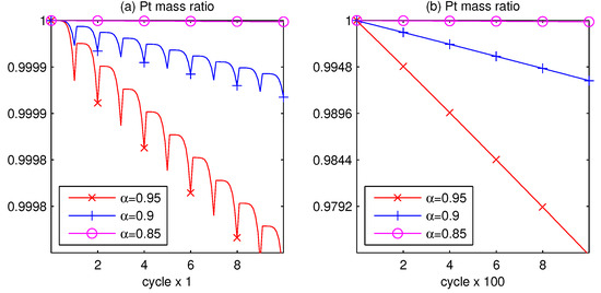 Indeed, starting from due to the initial condition (4) at , the decrease in the Pt mass ratio in time would imply loss of Pt ions up to when the CL is blocked and does not work anymore. Continuing the work of [15], we study the Pt mass loss under the operating conditions with respect to cycling voltage profiles.