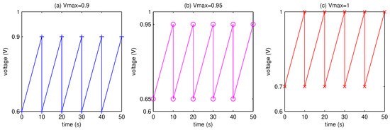 From Figure 8, we observe the decay of in time (during cycles) starting at 1, which is stronger at the larger upper potential level and weaker at the lower .
