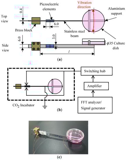 Figure 1a shows the practical construction of the proposed mini-vibration table which is designed based on the following analysis. Basically, vibrator of the table is made from one metal strip (stainless steel, 120 mm length × 6 mm width × 0.4 mm thickness as typical dimensions). Bi-morph type piezoelectric excitation is used utilizing piezoelectric elements (or PZTs) bonded on both side of the vibrator, where each side consists of four 6.0 × 3.0 × 0.2 mm PZTs (C-213, Fuji Ceramics, Shizuoka-ken, Japan) side by side. One end of the vibrator is rigidly clamped by two brass blocks. A culture dish with a 35 mm inner diameter is supposed to be mounted on triangular Aluminium support on the other free end of the vibrator. When voltage was applied to the PZTs on the vibrator, the inverse piezoelectric effect of the PZT bends the vibrator. This bending deformation causes the vibratory movement of the free end of the vibrator, as shown with a red arc in Figure 1a. Figure 1c shows the real view of the developed mini-vibration table with a cell culture dish on its free end. As shown in Figure 1b, by using the signal output function of the FFT analyser and an amplifier (NF Electric Instruments, HSA4012, Yokohama, Japan), a continuous sine wave is generated and applied to the PZTs of the vibration table. The cells in a culture dish mounted on the vibration table are stimulated dynamically with a given frequency, amplitude and direction. Eight such vibration tables can be set inside a conventional CO2 incubator after appropriate sterilization treatment. Practically, these eight vibration tables are electrically connected to the FFT analyser through a specially developed switching hub and are operated independently.