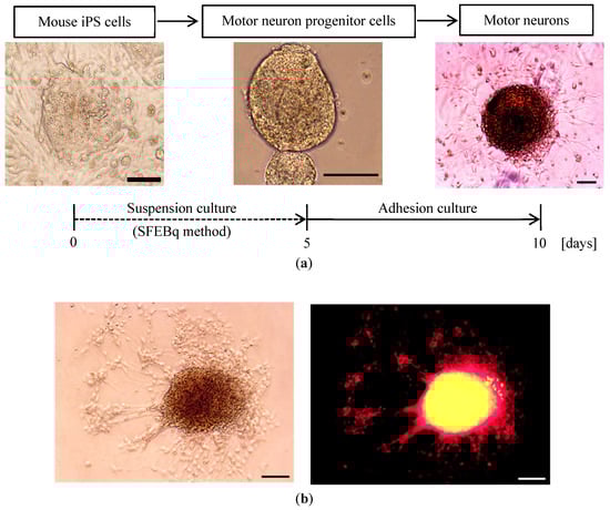 Even if the feeder cells remain partially, these can be removed each time by transferring spherical aggregates of the floating iPS cells to a new culture dish, since the feeder cells need to attach to the culture dish. Thus, any contamination of the feeder cells can be avoided in the following adhesion culture of the cells. Then, in the second stage, the neural progenitor cells are induced into neurons in adhesion culture with the above-mentioned medium plus 1 × 10−4 M all-trans-Retinoic Acid (Wako). This time the cells are seeded on four 2% Matrigel (FALCON)-coated dishes [33,34] and are cultured in the CO2 incubator (temperature: 37 °C, humidity: 100%, 5% CO2 + 95% air) for another four days. Main procedure of differentiation from mouse iPS cells into motor neurons is shown in Figure 2a together with a typical picture of the cell colony taken by a phase-contrast microscope.