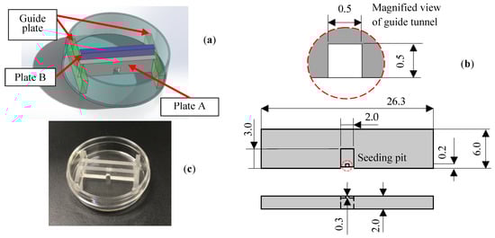 (1) Retractable twin plates (A, B) system with guide structure is constructed inside the φ35 culture dish as seen in Figure 3a,c. The plate A is equipped with 2.0 × 3.0 × 1.7 mm seeding pit together with 0.5 × 0.5 × 0.3 mm guide tunnel in its lower side as shown in Figure 3b.