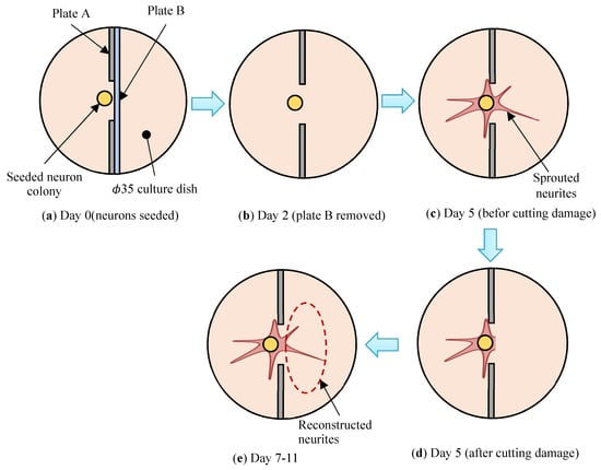 Schematic diagram of reconstruction experiments of the damaged neuronal cell colony by utilizing the developed system shown in Figure 3. (a) A neuronal cell colony is seeded at Day 0. (b) Plate B is removed at Day 2. (c,d) Cutting off damage is conducted at Day 5. (e) Reconstructed neurites are sprouting at Day 7–11.