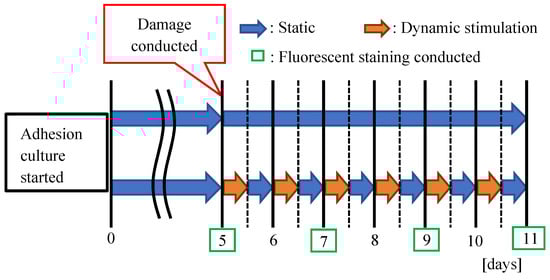 Experimental time scheme of reconstructing culture procedures of damaged neuronal cell colony by applying 12 h. Intermittent dynamic stimulations (vibration total amplitude: 60 µm, frequency: 5 Hz, 12 h. interval) for 6 days along with completely static case for comparison.