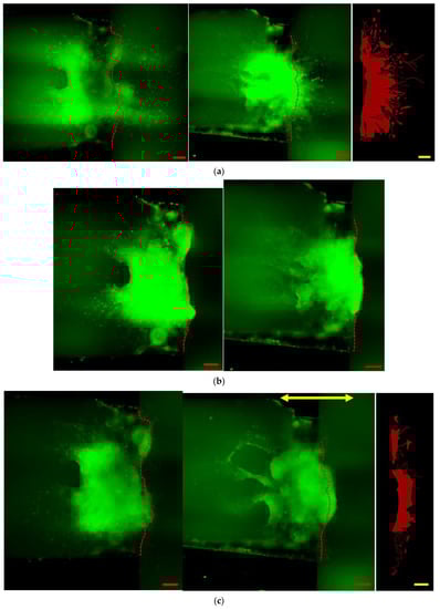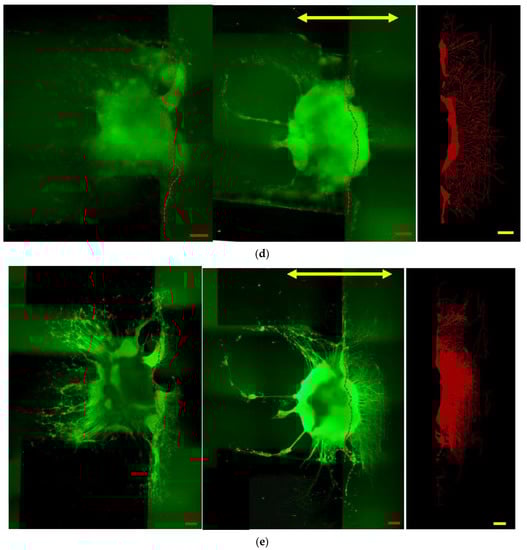 Figure 6 shows immunostained images of the in vitro reconstructing process of the damaged neuronal cell colony. Left side figures are the static case (control, without micro dynamic stimulation) for comparison. Right side figures are the case under micro dynamic stimulation (vibration total amplitude: 60 µm, frequency: 5 Hz, 12 h. interval). The reason why frequency of 5 Hz is used in this experiment is that it is most effective in differentiation and growth of mouse iPS cells into neurons as found by our previous study [23]. Figure 6a–d are stained fluorescent image by NeuroFluor NeuO, which has a remarkable ability to stain living neurons without fixation, and that the fluorescent image is continually observed under phase-contrast microscope throughout the experiments. As for Figure 6e, on the other hand, βⅢ-tubulin is stained after fixation of the cell colony in order to obtain a stable and clear image. It is clearly confirmed that neurites are sprouted around the seeding pit. Figures in green show direct fluorescent microscopic images with a dotted red line, which shows the approximate cutting line given from (b). The right end side figures in red show binarized images of the lost area (Alost in (a)) or the reconstructed area (Areconst. in (c), (d), (e)) in case of micro dynamic stimulation by utilizing WinROOF (scale bars = 200 µm). Furthermore, the yellow arrow in Figure 6c–e shows the direction of vibration stimulation by utilizing the developed mini-vibration table. Figure 6a shows the image just before cutting damage was made at day 5. Figure 6b shows the state immediately after the cutting damage (day 5), while the dotted red line shows the approximate cutting line. Black shadowy line behind the red cutting line shows the right-side edge of the Plate A explained in Figure 4. Figure 6c shows the initial reconstructing state (day 7 or 2 days after cutting damage) Neuronal reconstruction around the damaged boundary is gradually taking place by sprouting neurites in several points. Figure 6d shows the middle of reconstructing process (day 9 or 4 days after cutting damage) where reconstructed neurites are growing almost evenly and densely. Figure 6e shows the reconstructed final image in this series of experiment (day 11 or 6 days after cutting damage) where neurites are dramatically grown in numbers, density and length, especially in direction to the right-hand along with the cutting edge. This seems prominent in case under the micro dynamic stimulation.