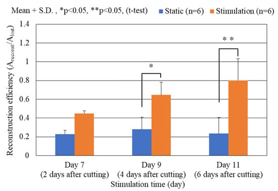 Figure 7 shows a comparison of reconstruction efficiency Areconst./Alost (computed area ratio from Figure 6) of the damaged neuronal cell colony between the statically cultured neurons and the dynamically stimulated ones (vibration total amplitude: 60 µm, frequency: 5 Hz, 12 h. interval) with respect to culture time after the cutting damage operation. The reconstruction efficiency increases with increasing culture time as 7, 9 and 11 days (or, 2, 4 and 6 days after cutting damage) in the stimulation cases, while the situation is not observed in the static cases. In all three cases, the reconstruction efficiency of the dynamically stimulated cases is prominently higher than that of the static ones. Significant differences are observed between the statically cultured damaged neurons and the dynamically stimulated ones as the culture time increases, such as 9 to 11 days (or 4 to 6 days after the cutting damage). At day 11 (6 days after cutting damage), it is found that the reconstructed area from the cutting damage is up to around 80% in the dynamically stimulated case, while the area is almost unchanged with culture days and shows around 25% in the static case.