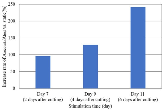 Figure 8 shows the relationship between the increase rate of reconstruction efficiency Areconst./Alost against the static case and the culture time. Y-axis is normalized reconstruction efficiency (stimulation/static) calculated from the results shown in Figure 7. The increase rate of reconstruction efficiency increases exponentially as the culture time increases, such as 7, 9, 11 days (or, 2, 4 and 6 days after cutting damage). The increase rate is the highest in the day 11 with about 241%, while it is about 96% in the day 7. It is found that the more the culture time after the cutting damage increases, the more the increase rate of reconstruction efficiency increases dramatically. This suggests that not only imposing the dynamic stimulation but also having appropriate culture time should be key factors to promote the reconstruction of damaged neuronal cell colony.