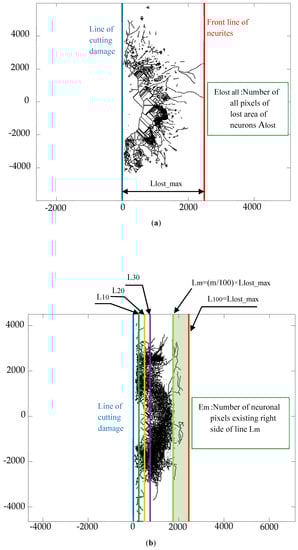 Definitions of parameters for the evaluation of extensibility of the reconstructed neurites of the colony [=(Em/Elost all) × 100] based on the typical binarized immunostained images. The value of m indicates the location line up to which the neuronal pixels are counted for, with m = 100 coinciding with Llost_max., while Em is the number of neuronal pixels existing on the right side of line Lm defined on reconstructed neurites of the colony after the cutting damage. (a) Definition of Llost_max:maximum straight-line length of neuron colony measured from edge line of the cutting damage to the furthest front line of the lost neurons; (b) Lm and Em defined on reconstructed neuron network.