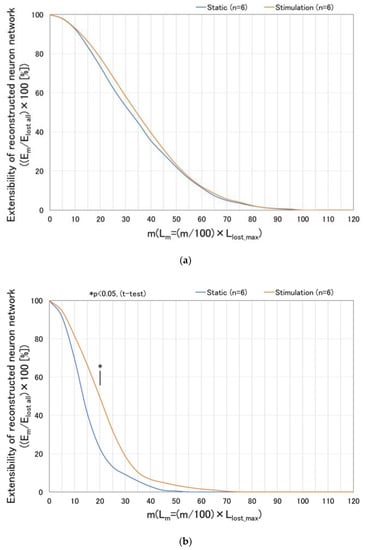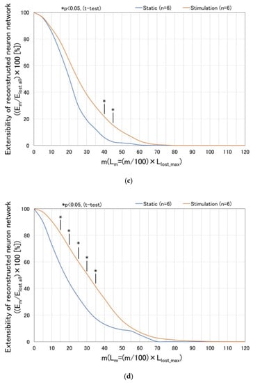 Figure 10 shows the effect of dynamic stimulation (vibration amplitude: 60 µm, frequency: 5 Hz, 12 h. interval) upon extensibility of the reconstructed neurites [=(Em/Elost all) × 100] with respect to the value of m (indicating location line up to which the neuronal pixels are counted for) as well as the culture time. Results are computed based on the parameters defined in Figure 9. At day 5 (Figure 10a), extensibilities of the statically cultured damaged neurons and the dynamically stimulated ones almost coincide with each other, since these are the initial state, i.e., just before the cutting damage. In Figure 10b–d, significant differences are observed between the statically cultured damaged neurons and the dynamically stimulated ones as the culture time increases, such as day 7, 9, 11, respectively (or 2, 4, 6 days after cutting damage). Especially, at day 11 (or 6 days after cutting damage), it is found that significant differences are observed in the cases with lower m such as m = 15~35, which correspond to comparatively proximal area to the cutting damage line. Furthermore, at day 11, maximum value of m in the stimulated cases reaches up to 110, which implies that reconstructed neurites finally surpass the initial length: Llost_max. (straight-line length measuring from the line of cutting damage to the front line). Thus, it is confirmed that the dynamic stimulation promotes reconstruction and extension of neurites within the damaged neuronal cell colony.