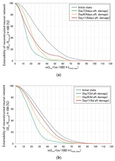 Figure 11 shows the effect of culture time after cutting damage upon the extensibility of reconstructed neurites [=(Em/Elost all) × 100] in the static case (a) and the dynamically stimulated (vibration amplitude: 60 µm, frequency: 5 Hz, 12 h. interval) case (b). Basically, figure axis and each data are the same as those given in Figure 10. On day 7, the extensibility of the reconstructed neurites in the dynamically stimulated case (Figure 11b) is far below compared to the initial state which is the state immediately before the cutting damage. However, the extensibility gradually increases as the culture time increases in order of 7, 9, 11 days (or 2, 4, 6 days after cutting damage), and reaches closer to the initial state. On the other hand, in the static case (Figure 11a), the extensibility does not increase systematically or stably as the culture time increases in order of 7, 9, 11, and it is not clear whether the extensibility is closer to the initial state or not, as the culture time increases. Especially, on the day 11, in the lower area of m, such as 0 to 22 which is the proximal area to the cutting damage, the extensibility is far below compared to the case of day 9.