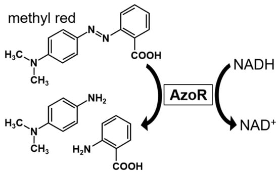 Reaction scheme of methyl red degradation to 4-(N,N-dimethylamino)aniline and anthranilic acid using azo reductase (AzoR). AzoR requires reduced nicotinamide adenine dinucleotide (NADH) as a coenzyme.