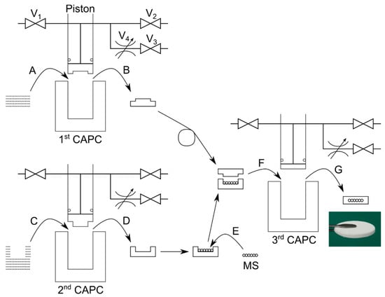 The procedure of CAPC treatment is presented in Figure 2. The stacked raw nonwoven fabrics were set in a high-pressure vessel (inner diameter: 32 mm), and the vessel was placed below a piston. The piston was lowered to the CO2 introduction position (1.2 mm for the 1st and 2nd CAPC and 2.4 mm for the 3rd CAPC). At this state, the V2 valve was closed, then the V1 valve was opened, and gaseous CO2 was introduced at a vapor pressure of 6 MPa. The CO2 was introduced while retaining the air that was initially in the high-pressure vessel. Then, the piston was lowered to the press position (0.7 mm for the 1st and 2nd CAPC and 1.8 mm for the 3rd CAPC) and stopped at the press position for a certain period. Then, the V3 valve was opened, and the CO2 was slowly evacuated over 30 s, and the V2 valve was opened to release the remaining CO2 into the atmosphere at once. The piston was then raised, and the CAPC product was taken out. The time for stopping the piston at the press position was 4 s for the 1st CAPC treatment to create the lid, 4 s for the 2nd CAPC to create the container and 20 s for the 3rd CAPC to join the lid and container. The process was performed at room temperature (22 °C) and the high-pressure vessel and piston were not heated during the process.