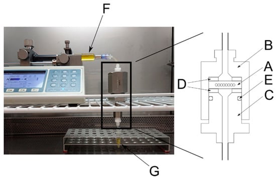 Setup of the enzyme reaction evaluation system. A = disk-shaped cartridge; B = sample holder; C = sample holder; D = gaskets; E = O-ring; F = syringe; and G = sample collector.
