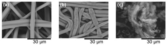 Figure 4 shows scanning electron microscopy images. The raw nonwoven fabric had large holes between fibers (Figure 4a). Even the enzyme-loaded mesoporous silica could not be retained in the nonwoven fabric. However, in the container fabricated using 2nd CAPC treatment, the fibers were dense, and the holes were small (Figure 4b). Fabricating the container with a sufficiently small pore size is necessary to prevent the mesoporous silica (Figure 4c) from spilling out.