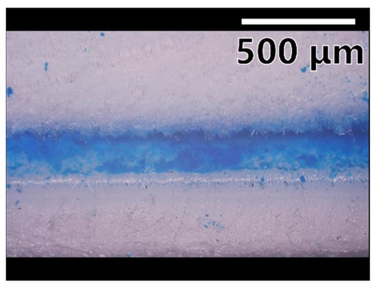 In order to confirm that the mesoporous silica is encapsulated, the results of a CAPC product using mesoporous silica colored with methylene blue are shown in Figure 5. Figure 5 shows a cross section cut with scissors and photographed with an optical microscope. The blue band is the layer of mesoporous silica encapsulated in the material. Since the mesoporous silica is encapsulated as a powder, blue dots can be seen on the upper and lower layers, which are the powder scattered during the cutting process. This observation shows that the mesoporous silica is confined in a band shape.