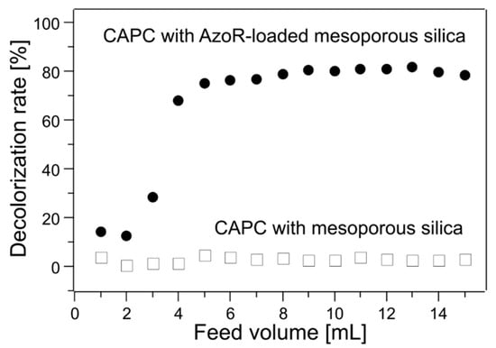 Figure 6 shows the evaluation results of the enzymatic reaction. Though the decolorization reaction did not proceed in the cartridge loaded with mesoporous silica without enzymes, the reductive degradation (decolorization) of methyl red was observed when the disk cartridge encapsulating AzoR-loaded mesoporous silica was used. The decolorization rate varied with the pumping rate (residence time). From these results, it was clear that the enzyme was trapped in the cartridge with its activity maintained. Furthermore, the enzyme was not deactivated via CAPC treatment, indicating that the enzyme-loaded disk cartridge was successfully created through CAPC. This unique flow reactor system based on the CAPC technique enables the efficient continuous decomposition reaction of azo dye and effective regulation of enzymatic activity by means of accurate control of the flow rate, leading the resolution of important issues such as continuous and scale-up operations in a batch-wise experiment [16].