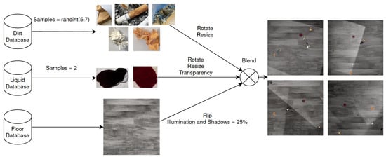 As mentioned in Section 1, there is a scarcity in annotated data in the area of automated cleaning systems. This scarcity is a problem in Machine Learning approaches because of overfitting [18]. A model overfits when it classifies data used for training accurately, but its accuracy drops significantly when facing new data (poor generalization). In order to tackle this problem, a tool proposed by [4] which is able to generate synthetic data was considered. This tool can blend dirt samples into clean floors in random locations, adding simulated light sources and shadows. It can also increase the number of data by applying geometric transformations to both floors and dirt samples. Therefore, it is possible to generate a large dataset from a small number of images. However, this tool presented a few problems that had to be tackled. Consequently it was upgraded and adapted as follows: