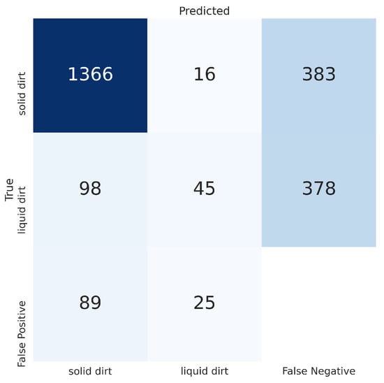 In order to observe the impact of dirt variety, a new dataset without liquid dirt was generated. A new YOLOv5m6 model was trained on this dataset following the same training procedure described in Section 2. This model was then tested on the ACIN dataset and attained a mAP of 0.874, as shown in Table 8. This improvement can be better visualized when comparing Figure 10 with Figure 15. It is also possible to observe in the confusion matrix shown in Figure 14 that removing the liquid samples from the training dataset improved the model when tasked with detecting only solid dirt. The number of true positives increased, and the number of false negatives and false positives decreased when compared to Figure 9. These results further show the negative impact of having a small variety of liquid samples in the synthetic dataset.