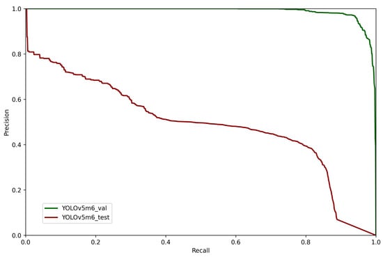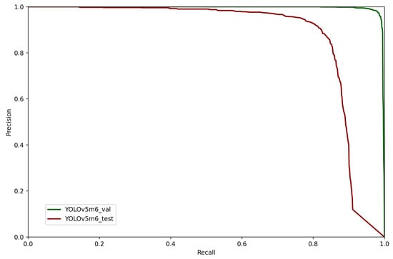 Figure 10 shows the precision-recall curves for validation and test of YOLOv5m6.