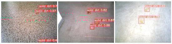 Table 2 shows the results on the ACIN dataset for two classes: solid dirt and liquid dirt. Table 3 shows the mAP obtained for each class. Table 4 shows the results for binary classification (dirty or not dirty), which can be relevant in situations where the floor-cleaning robots do not need to distinguish between different types of dirtiness. The time per inference in each model is shown in Table 5 and a comparison with existing methods that were used by [3,4] described in Section 1 is shown in Table 6.