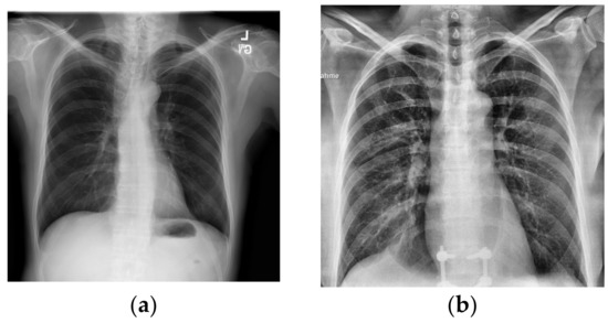 X-rays of healthy and infected patients. X-rays from [7,8]. (a) Sample X-ray for healthy lungs. (b) Sample X-ray for COVID-19-infected lungs.