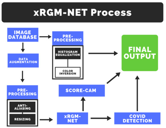 The general procedure for training xRGM-NET is both time efficient and effective. Once a clean dataset is obtained, the X-ray scan images are converted into a grey scale 227 × 227 numeric array. We then apply pre-processing and data augmentation to the image to enhance contrast as well as improve training. The pre-processed and augmented images are then fed into the xRGM-NET convolutional neural network to classify subjects as either positive or negative for COVID-19. We also utilize Score-CAM on xRGM-NET to generate a heatmap of the parts of the lung X-ray that are most indicative of COVID-19. This heatmap is exported to assist doctors or other medical staff in diagnosing COVID-19. Lastly, the original images are pre-processed using histogram equalization and color inversion. These processed images help emphasize opacities and artifacts in the lung that can help doctors identify a COVID-19 infection. Together, these three pieces of information—the COVID-19 diagnosis, the heatmap, and the processed images—assist doctors in quickly identifying COVID-19 in patients. This process is illustrated in Figure 2.