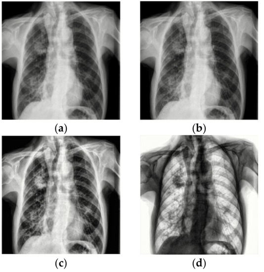 Image Pre-processing applied to X-ray. Original X-ray from [8]. (a) Original Image. (b) Image Reshaped to 227 × 277. (c) Histogram Equalization Applied. (d) Image Inversion.