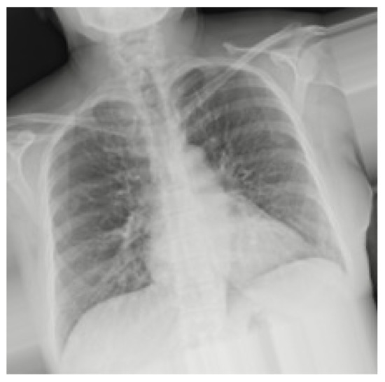 Although the images in the Cohen COVID-19 X-ray Database and NIH ChestX-ray8 Database are consistent in terms of lung area photographed, they vary in the physical dimensions of the image. CNNs require a consistent image input dimension (preferably square), so we resized each image to 277 × 277 × 1 tensors and applied anti-aliasing to not sacrifice image quality in the process and possibly lose important details of the image. This is seen in Figure 3b.