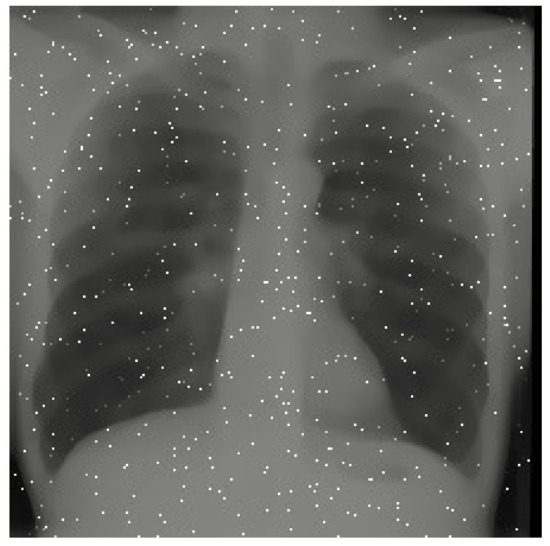 The next category of data augmentation we used involved adding noise, applying a median filter, conducting image inpainting, and adjusting brightness. These were all attempts to lower image quality and add artifacts that simulate defects found in real world scans. For noise, we randomly generated Gaussian noise and added it to the image. For larger speckle noise, we generated the same Gaussian noise but then used a median filter to bunch the noise up into dot-like artifacts on the image. For image inpainting, we first generated noise and used it as a mask, deleting the parts of the image where noise was present. We then used inpainting to take into account the nearest pixels to fill in the now empty areas where the noise mask was on the image. Finally, for brightness, we used the inbuilt Keras ImageDataGenerator class to randomly adjust the brightness of the image. These data augmentation techniques all served to prepare the model for more realistic scenarios where the X-ray may not be as clean as in a database. An example of a image quality augmentation can be seen in Figure 5.