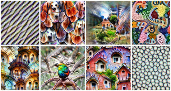 - Olah, C.; Mordvintsev, A.; Schubert, L.; Feature Visualization. Distill 2017. Available online: https://distill.pub/2017/feature-visualization (accessed on 2 September 2021). [CrossRef]