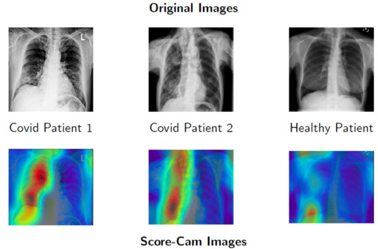Ultimately, we decided to use another method very similar to Grad-CAM called Score-CAM because of its smoother, more consistent, and less noisy heatmaps [23]. Score-CAM finds the weights connected to individual pixels and filters of the image, thus finding which parts of the images have the most influence on the output of the CNN. Using Score-CAM, we generated heat maps of our X-rays that showcased the areas in the lung that xRGM-NET recognized as important for determining whether the patient was infected with COVID-19 or not. Areas in red represent opacities or spots in the lung that might indicate COVID-19 while areas in blue are parts that represent normality. As seen in Figure 7, the two COVID-19 positive patients have large opacities on the left sides of their lungs and these are shown in the Score-CAM images with dark red ovals. However, on the healthy patients, there is a distinct lack of these red markers and the lungs are shown to be healthy.