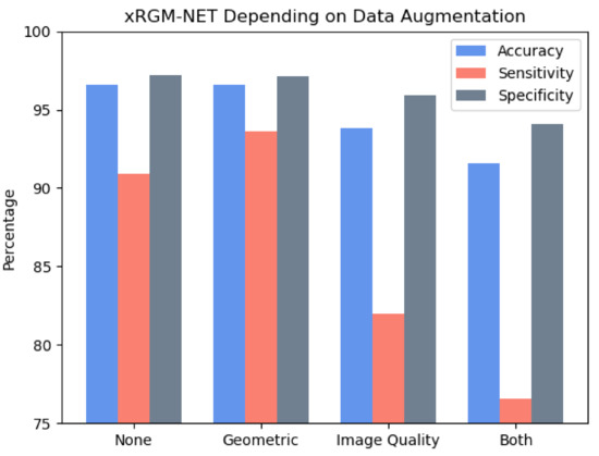 To further confirm the validity of these results and analyze the effects of geometric augmentation on other models, we performed geometric augmentation on VGG-19 and AlexNet. These are visible in Table 2. As seen, geometric augmentation improved AlexNet’s accuracy, sensitivity, and specificity but negatively affected VGG-19s accuracy, sensitivity, and specificity. These inferior results for VGG-19 are reasonable given that VGG-19 has too many parameters for the training size, and so it overfitted the data. While normally, as it did for AlexNet and xRGM-NET, conducting geometric augmentations can help reduce overfitting, because VGG-19 has so many parameters, it overfitted the augmented data which explains the worse performance.