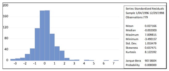 Histogram of the Standardized Residuals of GARCH (2, 2) model for the 1996–1998 period.