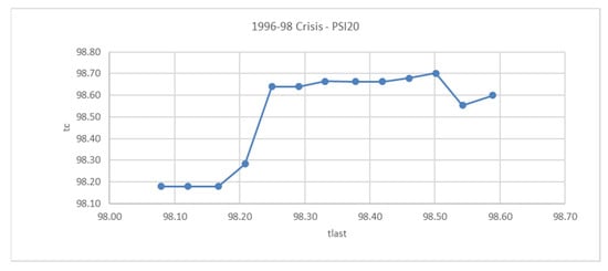Data comprises the prices of PSI-20 Index from the Portuguese stock market retrieved from DataStream, starting at 31 December 1993. We use the linear log-periodic defined in Equation (1), and we created post-dictions of the 1998, 2007, and 2015 crashes using data from the start of the new trend, until 8 months before the crash. Then, we created a new sample with the same starting point and advancing to the last data point in 2 weeks. We repeated the procedure until 2 months before the crash point. In this way, we analyzed if the results were robust to the sample changes, and if they tended to converge to the same critical date, (the date with the highest probability of a crash), or if it continued changing, making the results not reliable.