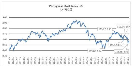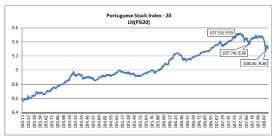 For the analysis of the 2007 crash in the PSI-20, we take tfirst = 103.15 (24 February 2003) as the first data point of the sample, since it is the point where the bullish trend started. Our earlier last data point tlast is equal to 106.96 (15 December 2006). It can be observed as a global peak at 107.54 (17 July 2007), a local minimum after the first downward movement at 107.74 (26 September 2007), and another lower minimum at 108.06 (23 January 2008), as observed in Figure 4.