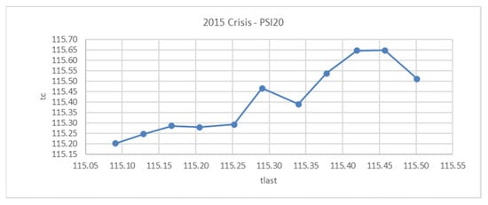 In the case of the 2015 crisis, results seemed to vary more frequently. However, the stock market behavior showed many curves and the tc seem to converge to two different local peaks, as shown in Figure 9.